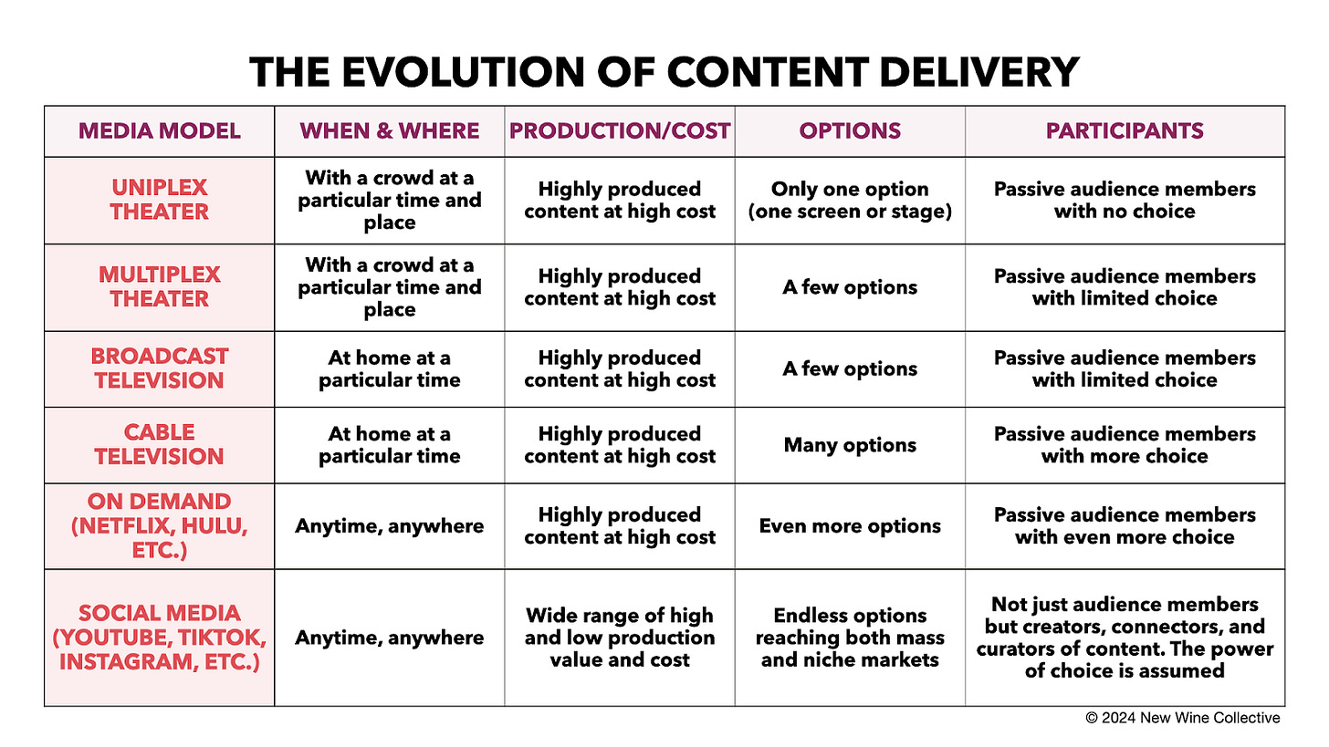Of course, this shift has been largely driven by globalization, new technology, and the advent of the information age. One can trace this evolution over the last 80 years of visual media: from single-plex movie theaters, where passive audience members consumed content at a fixed time and place, to social media, where anyone can engage anytime, anywhere, across multiple devices.