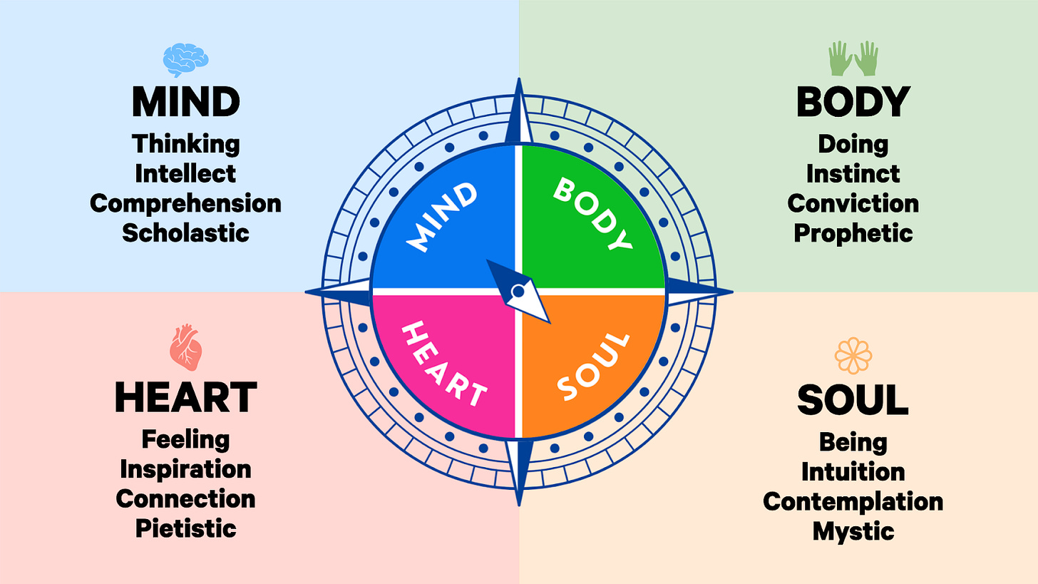 Curate many pathways, not just limited programs. Rather than asking “How do we get people into our programs?”, start asking “How do we help people discern what they need next?” This might mean explicitly naming the different ways people in your community connect with God — contemplative practices, theological exploration, embodied worship, service and justice, creative expression — and pointing to resources, even if they exist outside your regular programming or what happens on Sunday morning.